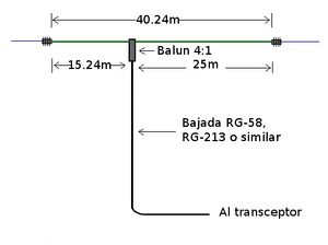 468 /3,7 MHz = 126,48 pies (total de la longitud de 1/2 onda) Rama corta = .378 (37.8%) X 126,48 = 47,81 pies Rama Larga = .622 (62.2%) X 126,48 = 78,67 pies radiador vertical = 80 metros / 4 = 20 pies. Para pasar los pies a metros hay que tener en cuenta que 1 pie = 30,5 cm (0,3048 metros). Fuentes